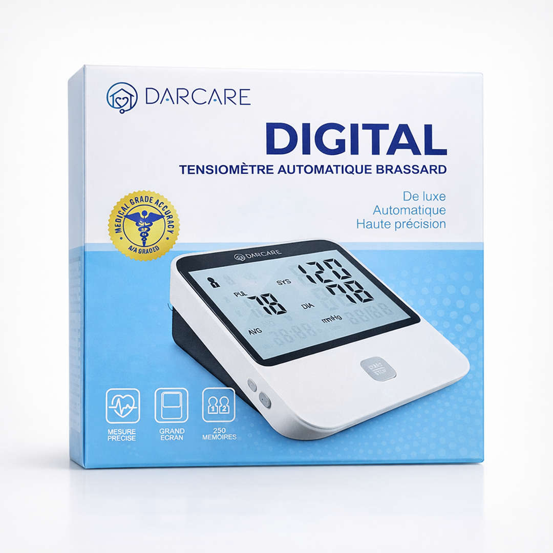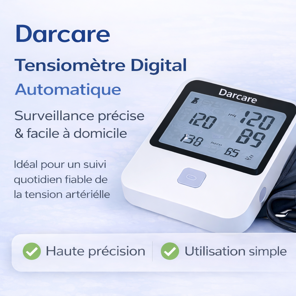 Le tensiomètre digital automatique DARCARE est conçu pour un usage domestique simple, rapide et fiable. Il permet de mesurer la tension artérielle avec précision en quelques secondes, en toute tranquillité à la maison.